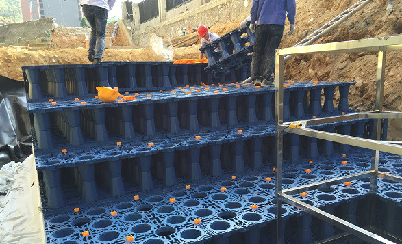 雨水收集儲存特別適用于下部土壤地質構造的透水性能不滿足透水性鋪裝要求的地段。蓄水池一般建于地下,匯集貯存雨水用作城市非飲用水的直接水源,或用作建筑物內外沖洗用水、綠化用水,這在一定程度上可以緩解城市供水的壓力。
